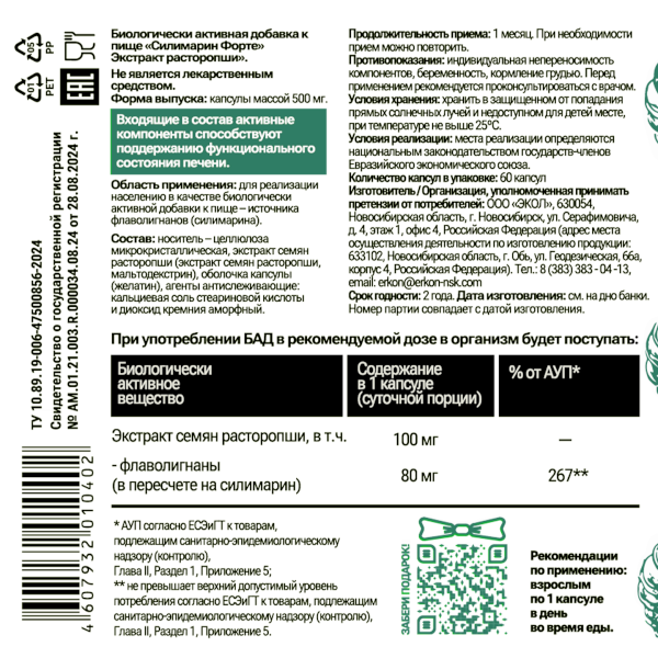 Показания: в качестве биологически активной добавки к пище - дополнительного источника силимарина.