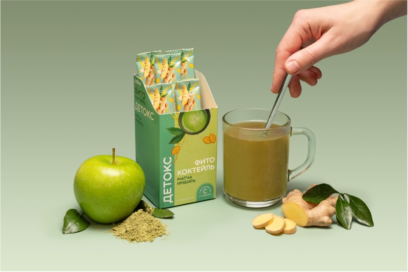 Фитококтейль Детокс - это полностью натуральный коктейль на основе экстрактов антиоксидантных трав со вкусом чая матча и имбиря.
