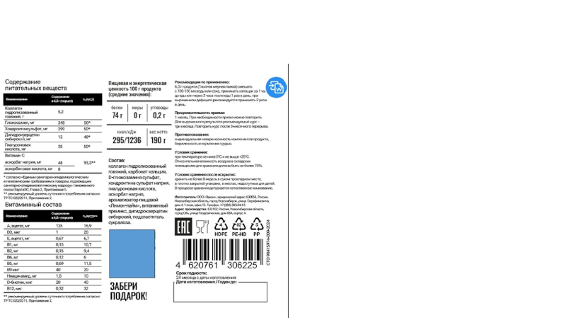 Комплекс дополнен хондроитином, глюкозамином, гиалуроновой кислотой, дигидрокверцетином и аскорбатом натрия. Данная формула представляет комплексный подход к решению проблем, связанных с дефицитом коллагена в организме, с направленным действием на связки и суставы. Отличную усвояемость коллагену TOP БАД обеспечивают: хондроитин и глюкозамин, которые содержатся в хрящевой ткани и являются её важнейшими структурными элементами.